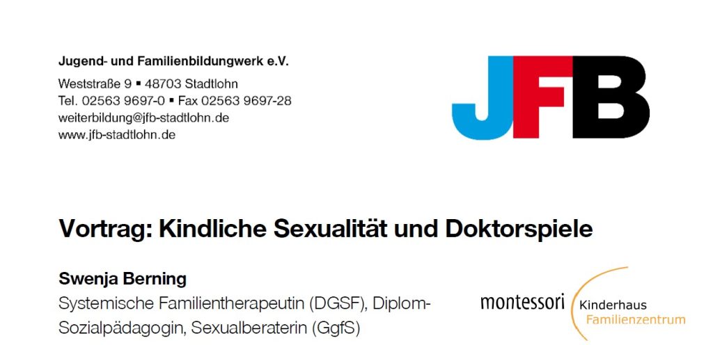 Mittwoch, 25. Oktober 2023 19.00 Uhr im Montessori-Kinderhaus, Maria-Montessori-Weg 1, 46325 Borken Elterninfovortrag: Kindliche Sexualität und Doktorspiele Wie funktioniert mein Körper? Kinder entdecken ihre Umwelt, indem sie sie hinterfragen, erleben und erforschen. Mit ihrem Körper verhält es sich ebenso. Da kann die Frage eines vierjährigen Mädchens, ob ihr auch mal ein Penis wächst Eltern und…