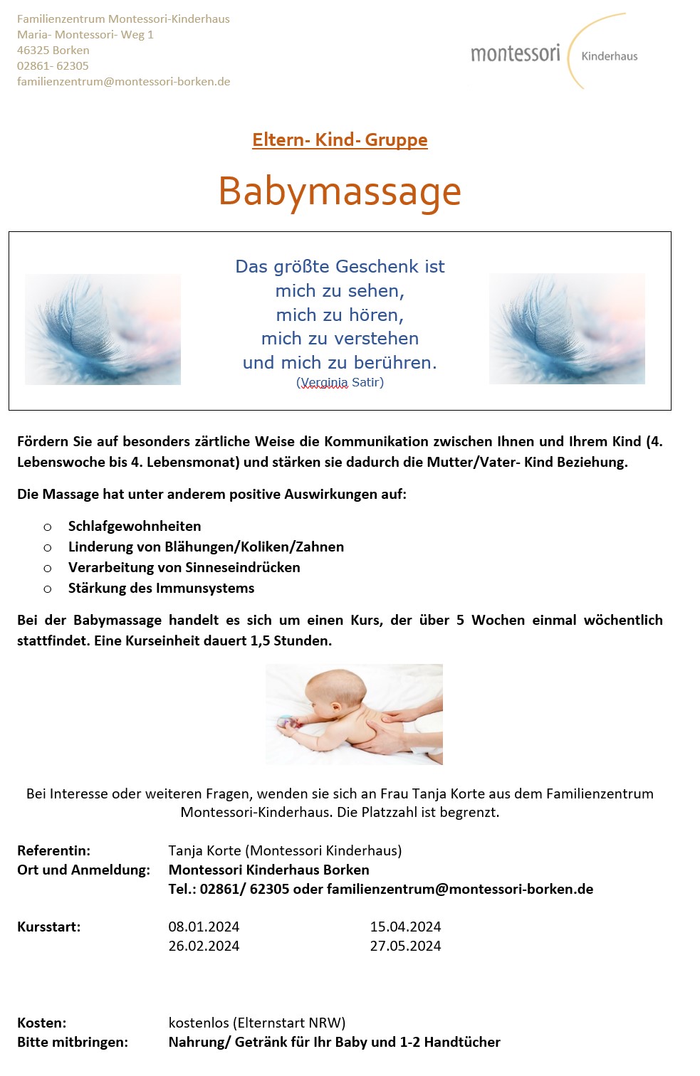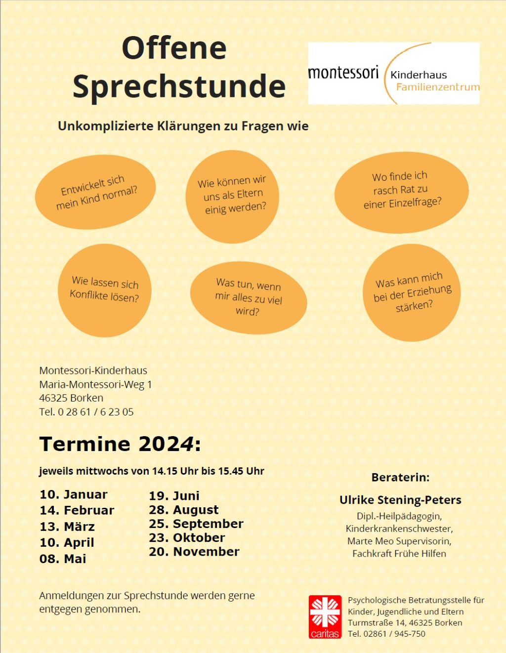 Auch in diesem Jahr kommt Frau Stening-Peters vom Caritasverband Borken zu uns ins Montessori-Kinderhaus und bietet eine (anonyme) Sprechstunde für Eltern von intern, als auch extern an. Die ersten Termine für 2024, jeweils mittwochs von 14.15 Uhr bis 15.45 Uhr: 10. Januar 2024 14.Februar 2024 13. März 2024 10. April 2024 08. Mai 2024 Neben…